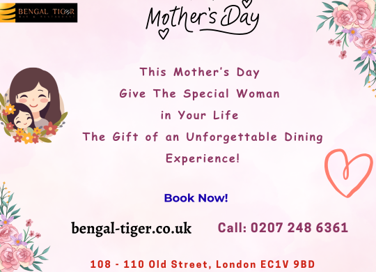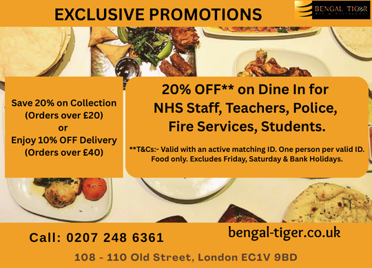 Bengal Tiger is an Award Winning authentic Indian restaurant and bar serving in Modern Style, located on a convenient location at Old Street in Shoreditch, City of London, EC1 near Islington. Serving from exotic starters to mouth-watering main courses, side dishes, desserts, and all your favourite drinks from beers, wines, champagnes, cocktails, mocktails and accompaniments, The Bengal Tiger has it all.